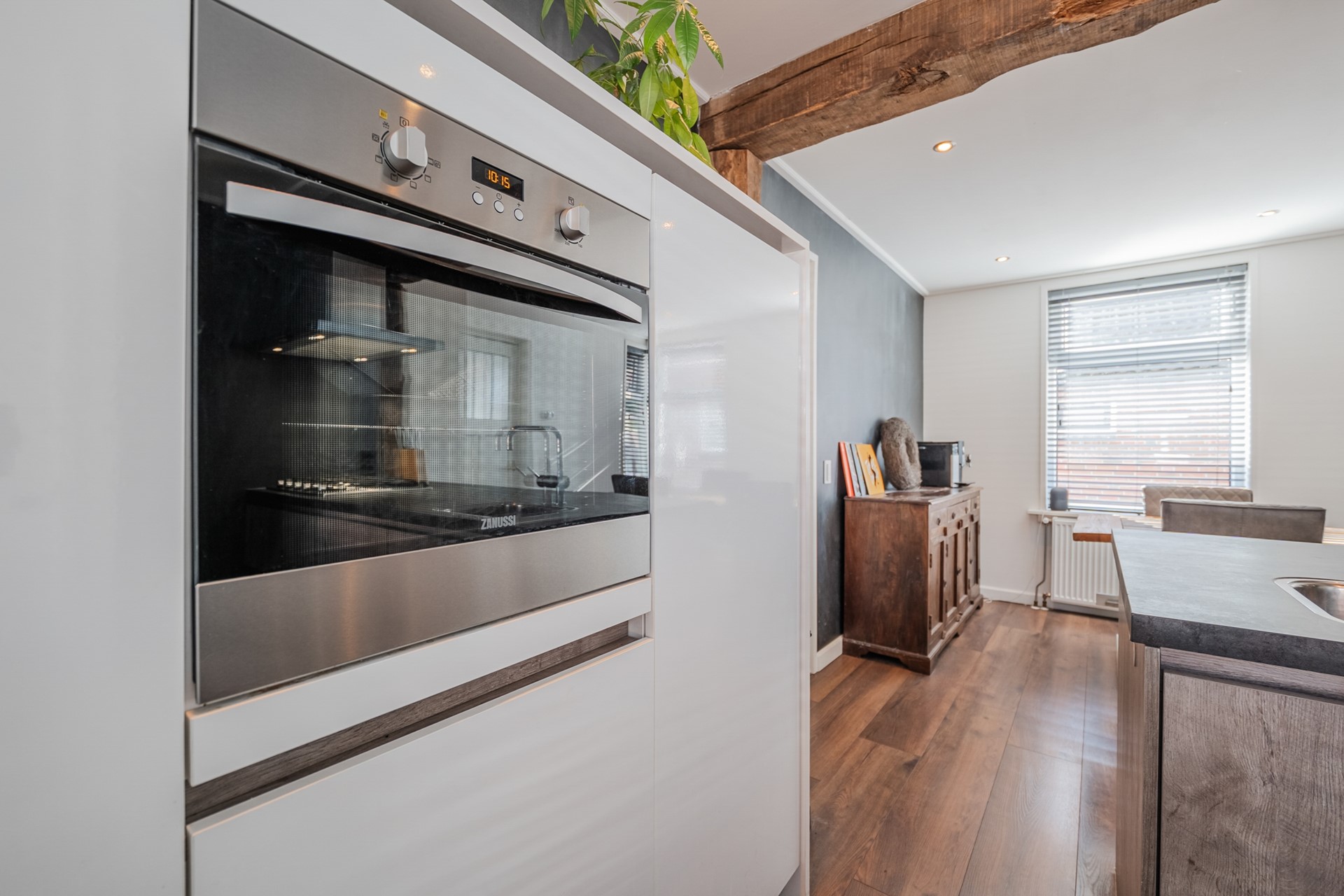 - Ruime Woonkeuken voorzien van inbouwkeuken met diverse inbouwapparatuur; combimagnetron, koelkast, 5-pits gaskookplaat, RVS afzuigkap en vaatwasser.