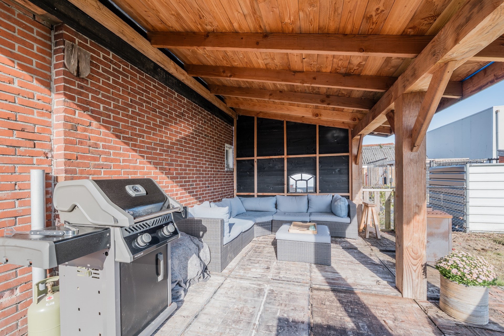 - Aan de achterzijde van de woning is een ruime, houten overkapping/veranda geplaatst.