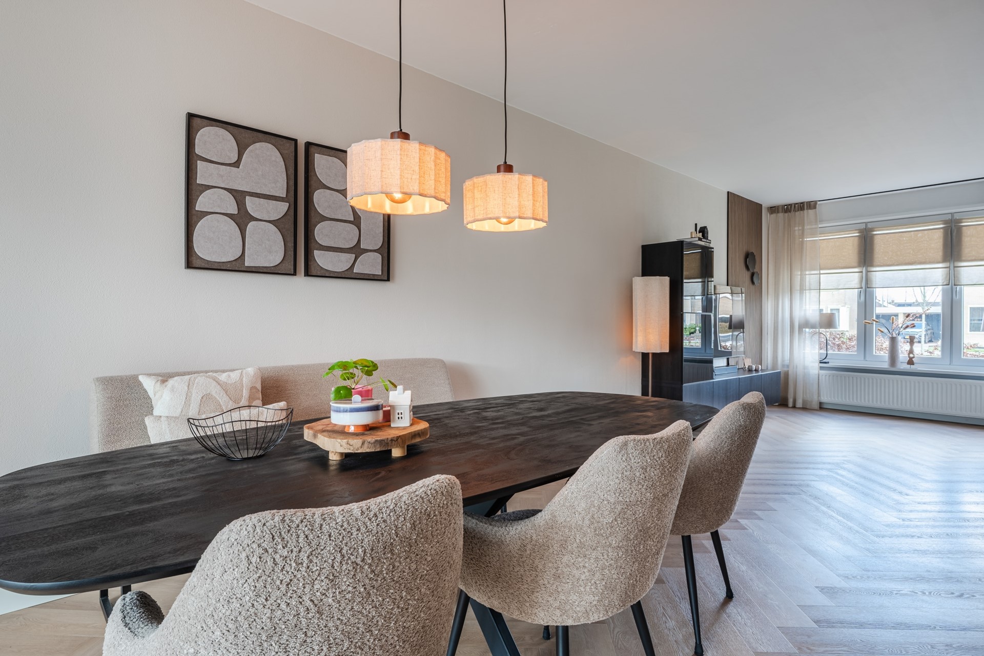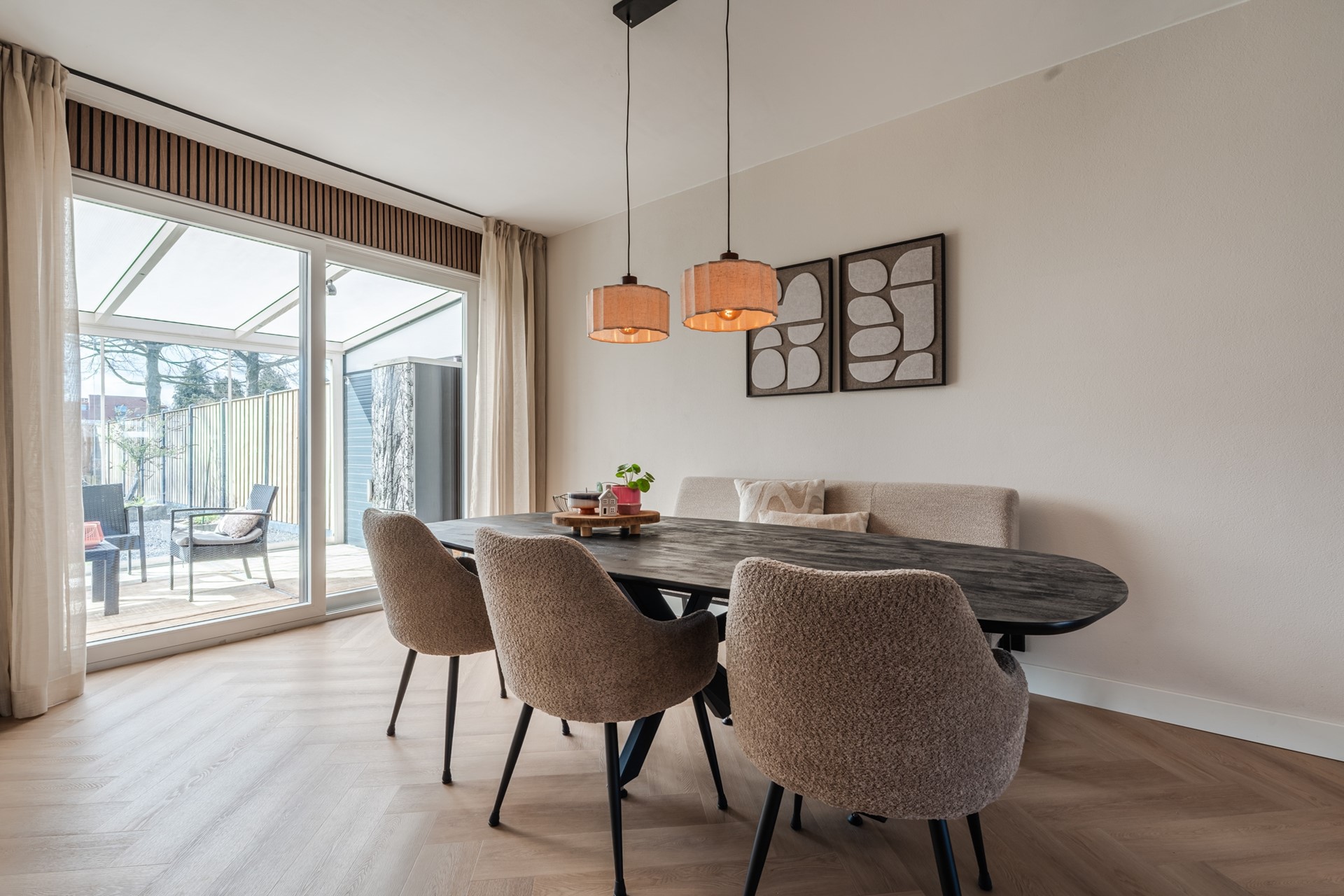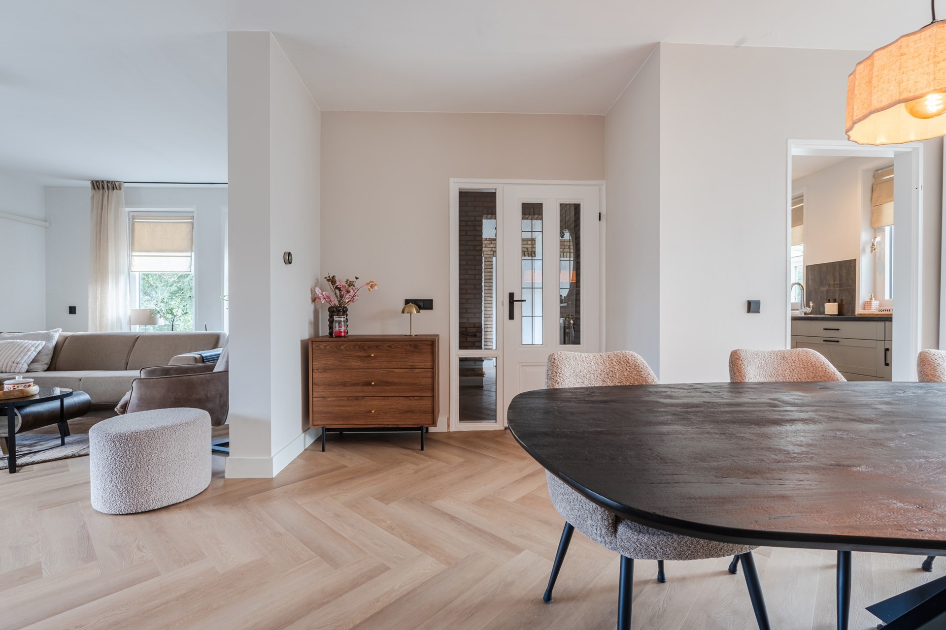 - Zeer ruime, lichte woonkamer voorzien van een visgraad PVC vloer, open haard, airco en schuifpui naar de serre