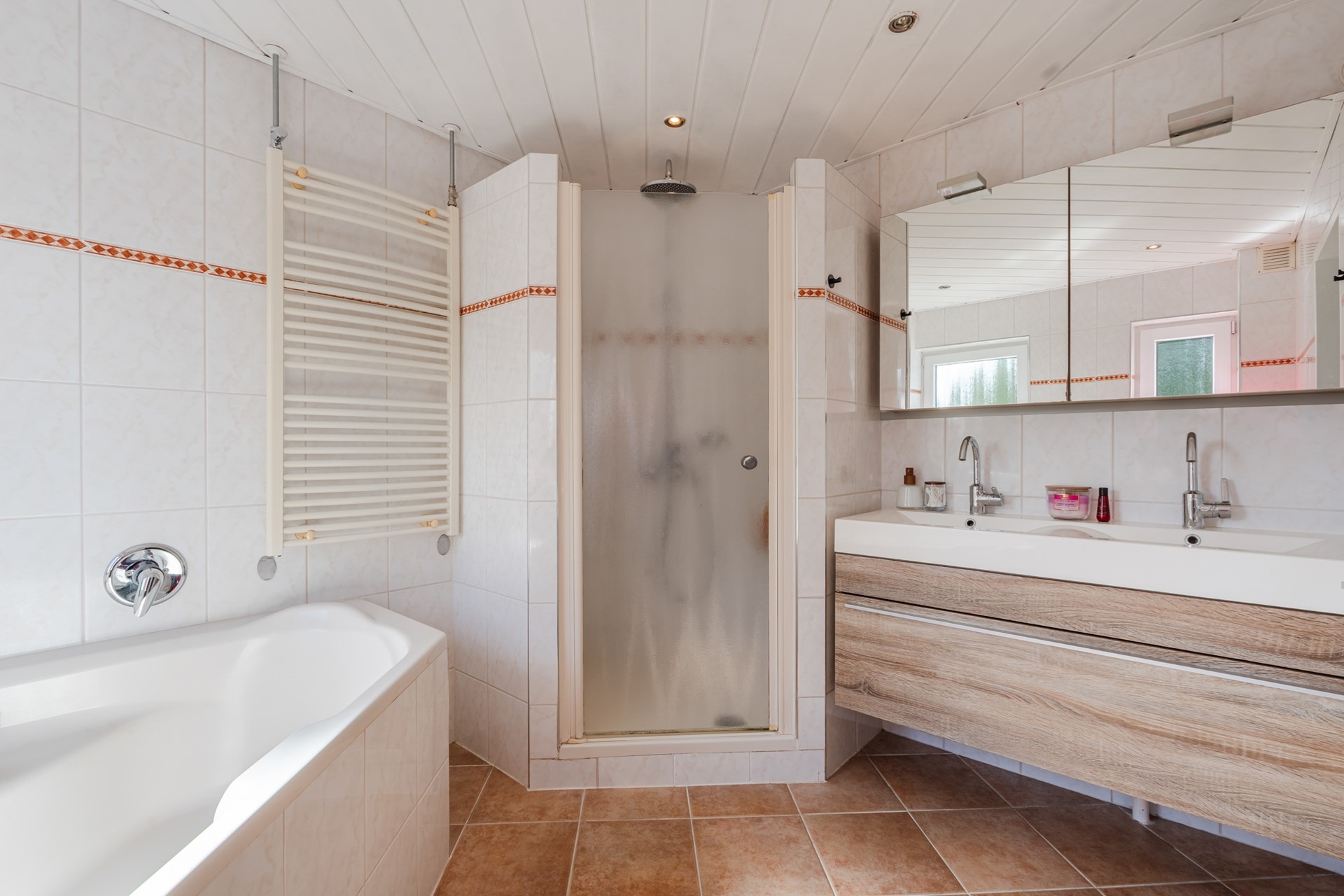 - Badkamer met hoek-bad, douche, dubbele wastafelmeubel, toilet en designradiator