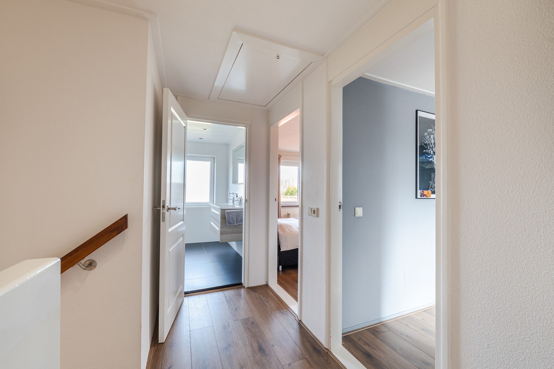De verdieping is volledig voorzien van een doorlopende laminaat vloer.