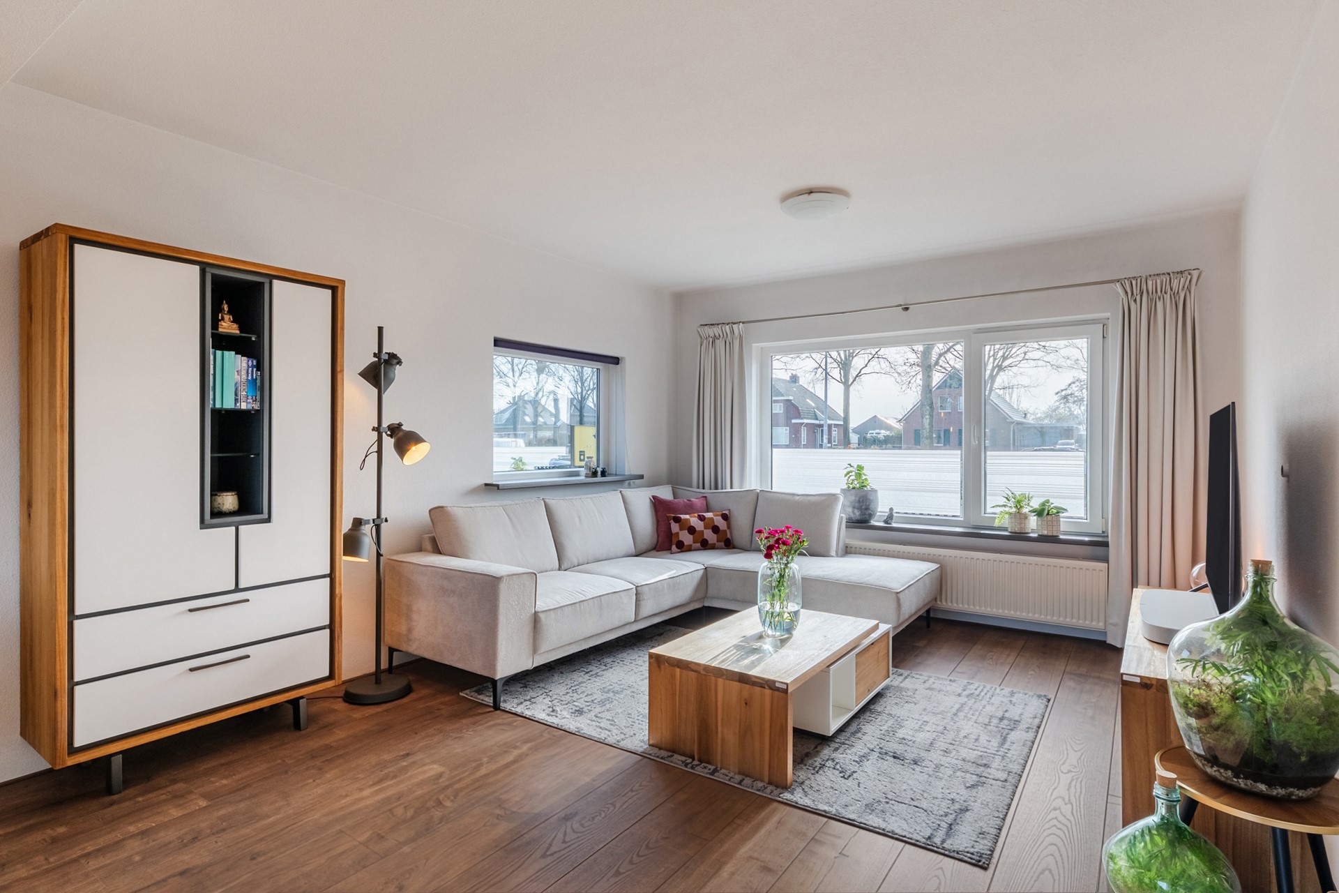 - Ruime woonkamer met laminaat vloer.